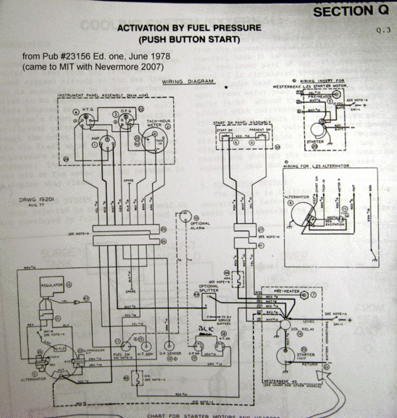 Engine Wiring Diagram, our camera pic of hardcopy that came with Nevermore; Westerbeke 50 Engine Tech Manual, Edit. One June 1978. Note this is top 2/3 of dgm; inset dwgs are on separate pic